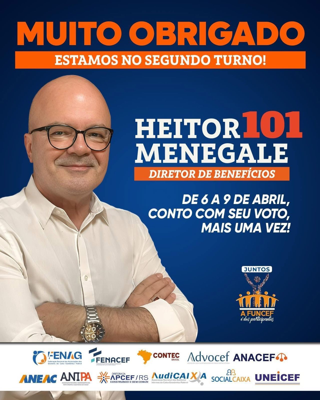 Reafirmando sua posição desde o primeiro turno, a Diretoria e o Conselho Deliberativo da APCEF/RS mantêm o apoio à candidatura de Heitor Menegale (101) para a Diretoria de Benefícios.