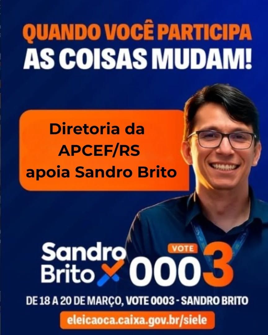 A diretoria APCEF/RS reafirma seu apoio à candidatura de Sandro Brito, número 0003. Empregado da instituição há mais de 20 anos, Sandro construiu sua trajetória atuando nas áreas de atendimento e na representatividade dos(as) empregados. Foi dirigente sindical e associativo e acumulou experiência no dia a dia operacional e na defesa das pautas dos empregados,
