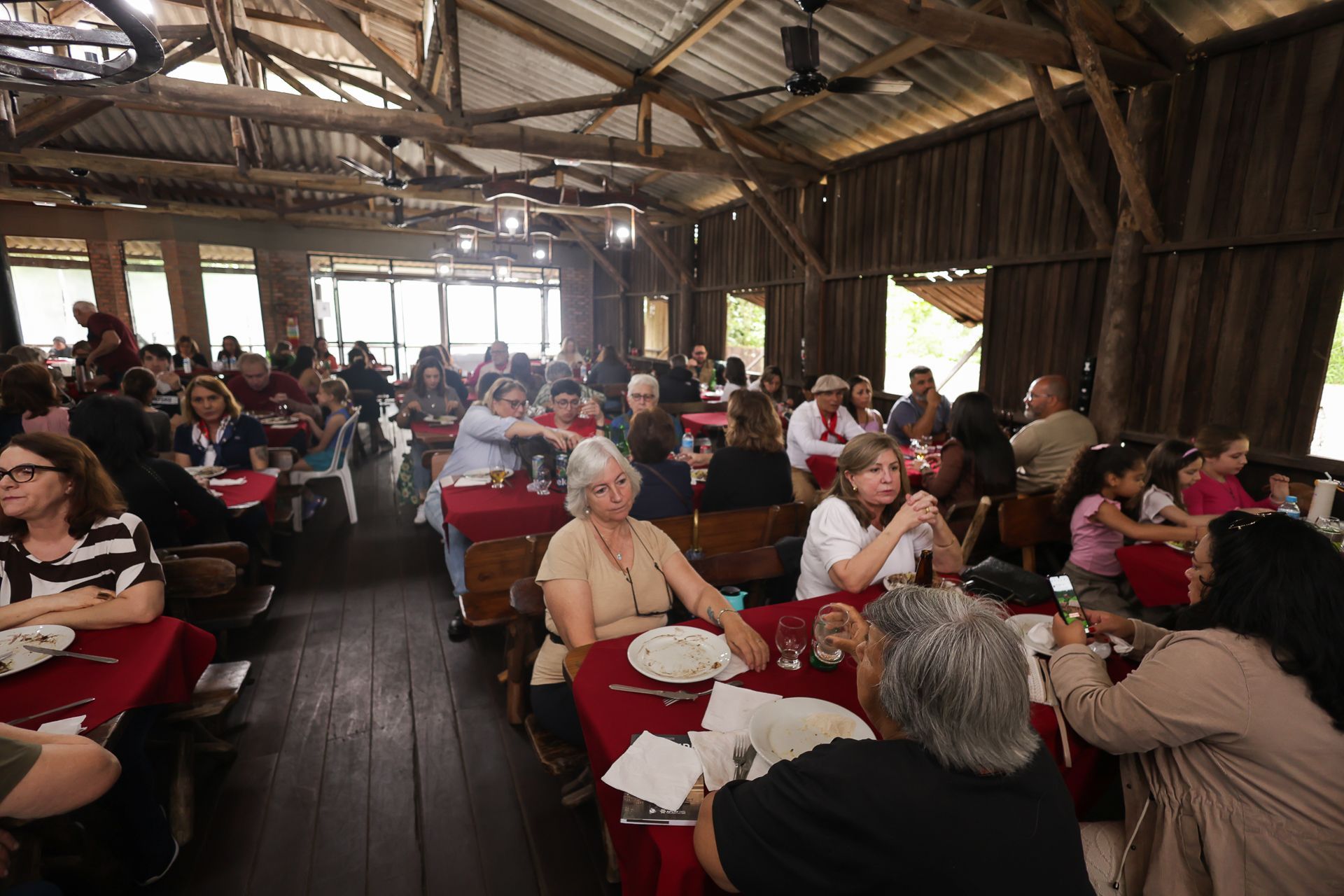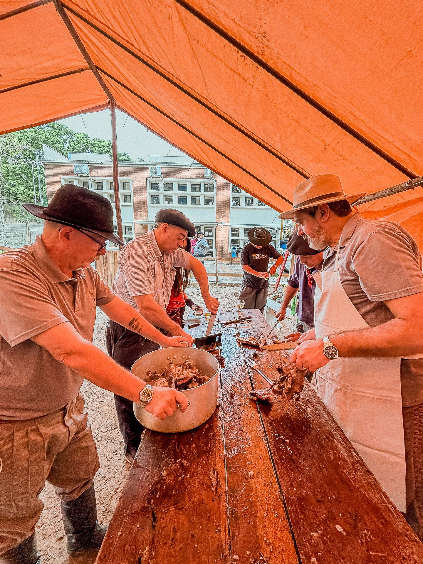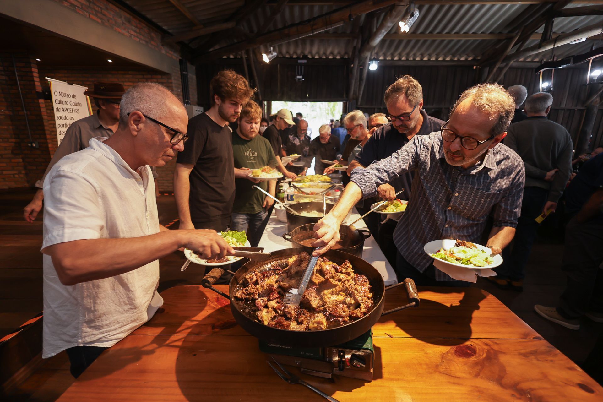 No cardápio, costelão assado na vala, com direito a acompanhamentos e sobremesa, tudo preparado com muito carinho pelo Núcleo de Cultura Gaúcha. O almoço foi servido às 13h, mas a movimentação começou já pela manhã, com a mateada à beira do Guaíba, um momento de boas conversas e reencontros.