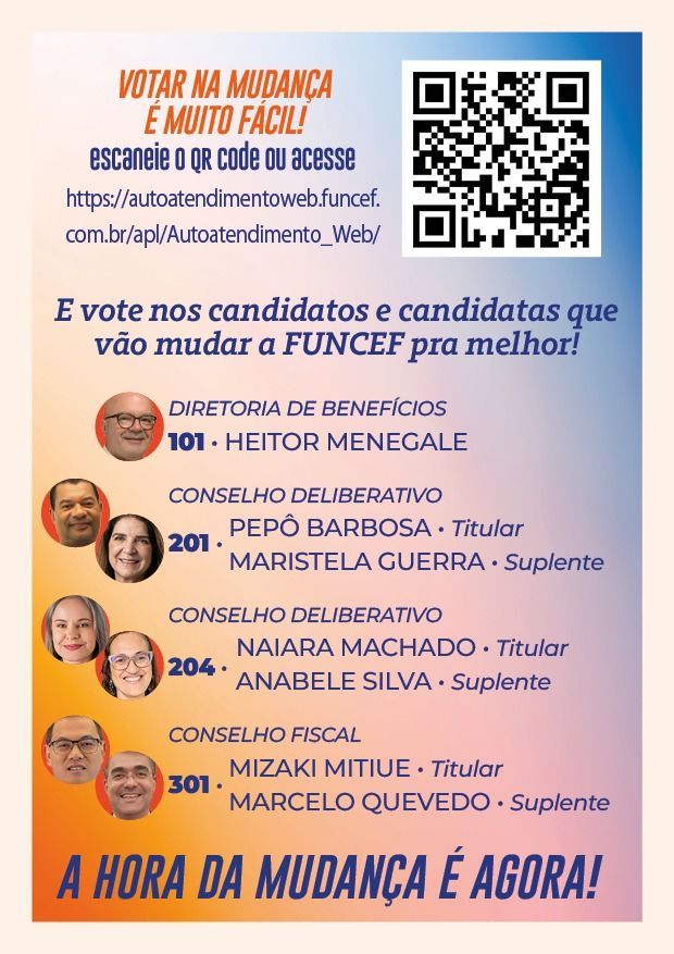 A FUNCEF é o nosso patrimônio. Cuidar da FUNCEF é cuidar da nossa aposentadoria, da nossa segurança e do futuro de milhares de famílias. Participe!