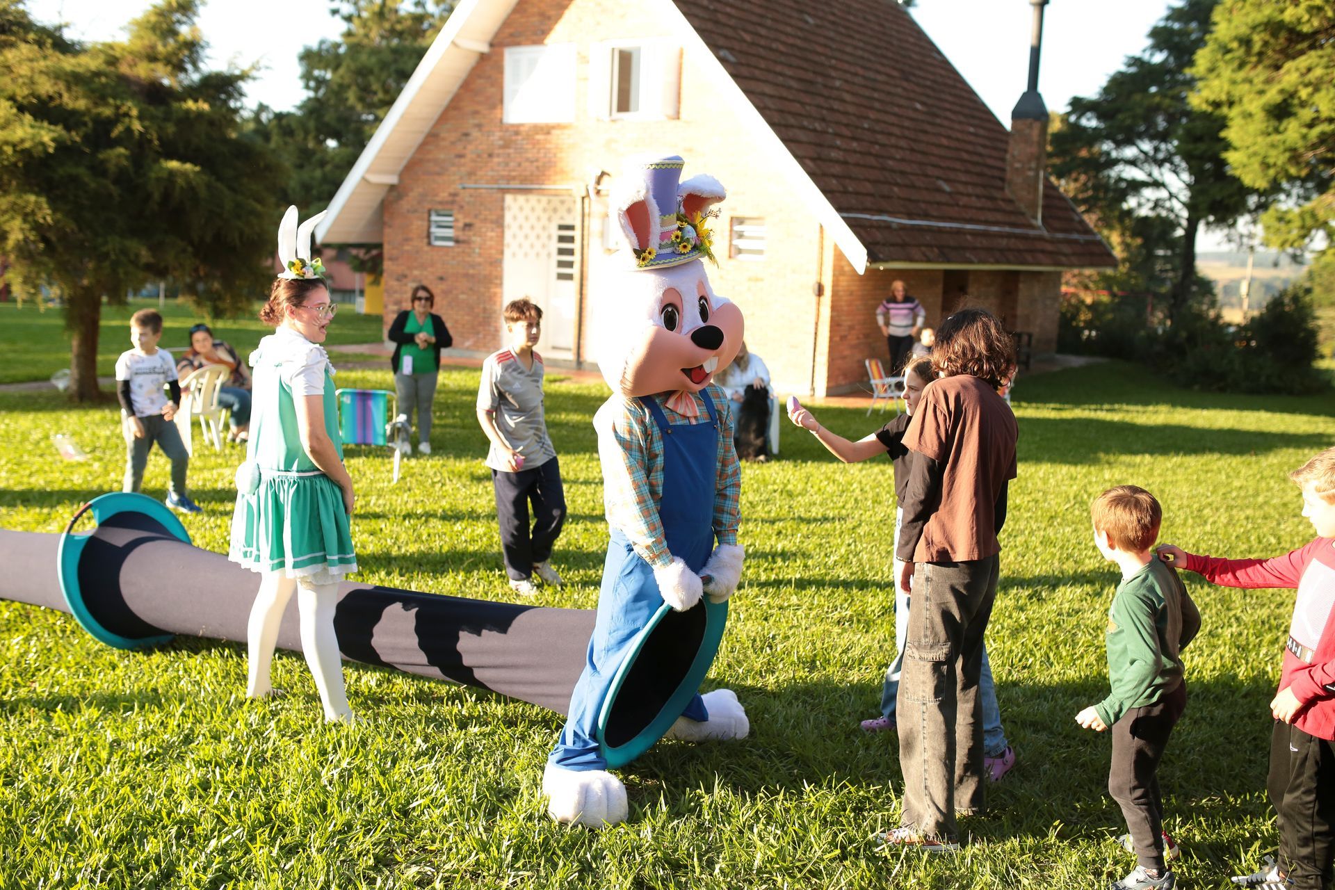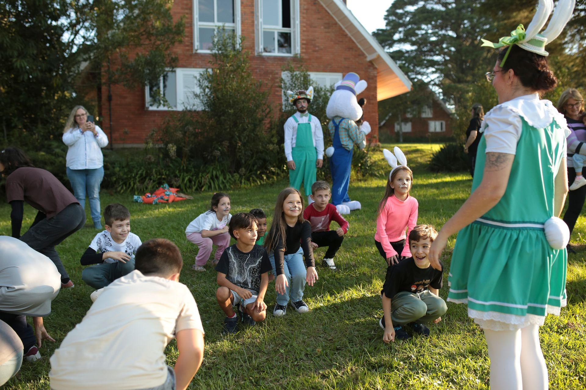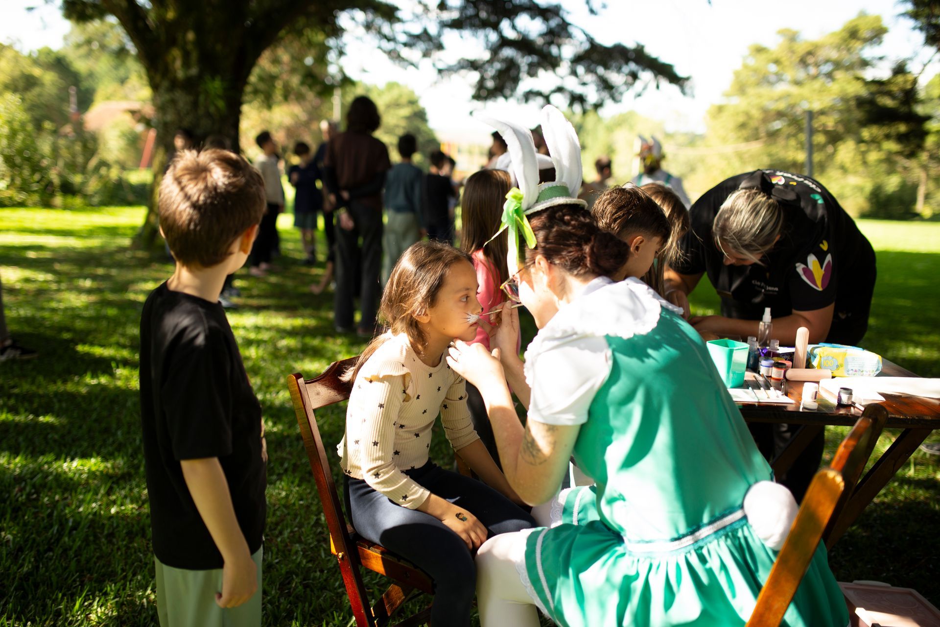 Na tarde de sábado, as crianças participaram de oficinas recreativas, como slime, culinária e atividades lúdicas, enquanto os pais puderam aproveitar o dia ensolarado, confraternizar com outras famílias e compartilhar bons momentos, inclusive com o tradicional chimarrão. A presença do coelho da Páscoa encantou as crianças, tornando a experiência ainda mais especial.