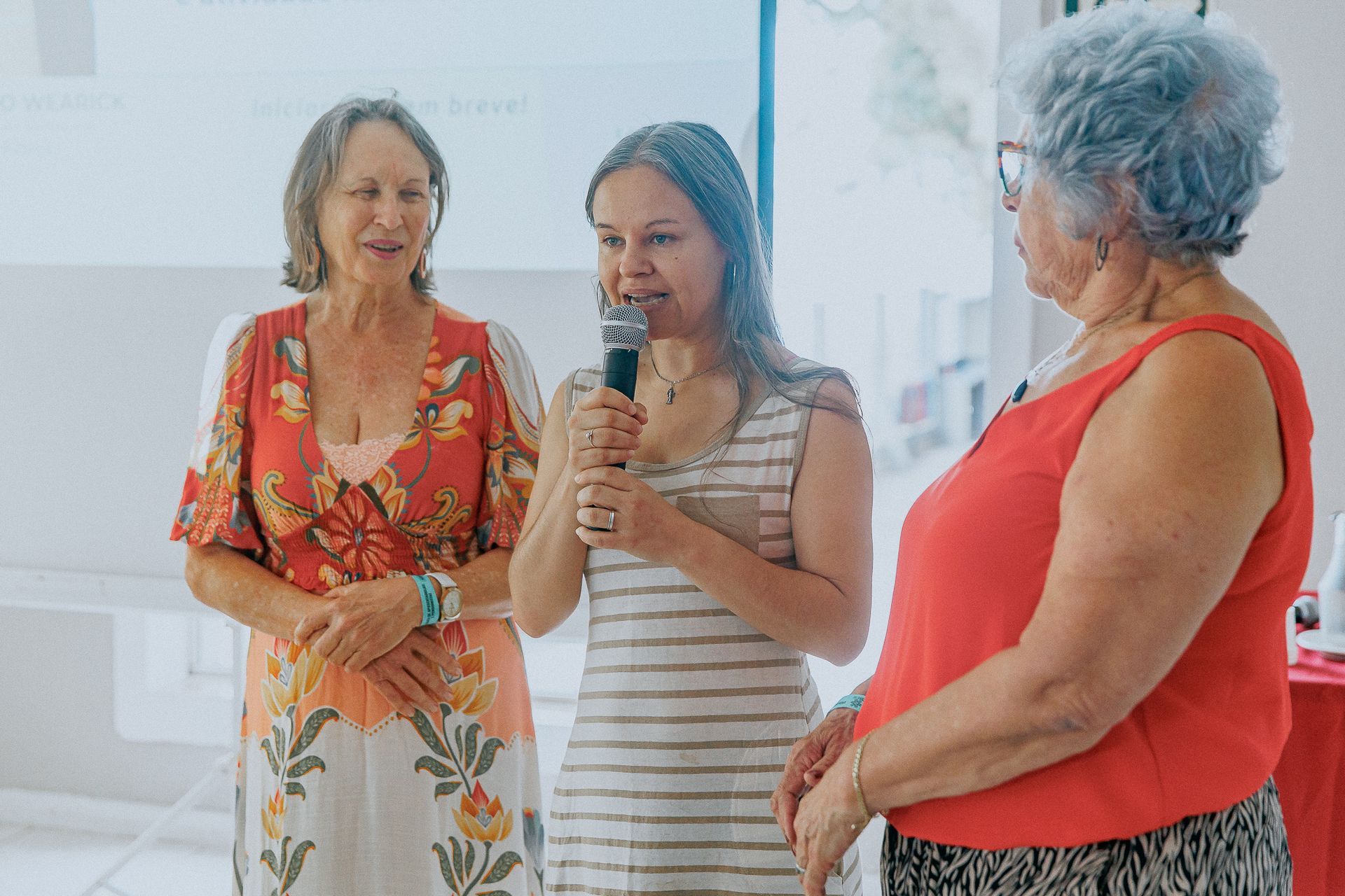 Após a palestra, o público foi direcionado ao salão de festas, onde a presidenta Naiara Machado da Silva deu as boas-vindas e realizou uma homenagem ao Núcleo de Cultura Gaúcha da APCEF/RS, reconhecendo a dedicação e o apoio às atividades da Associação. Representaram o Núcleo o coordenador Jânio Antônio Martins e o integrante Sérgio Tolentino Pinheiro, que receberam um presente das mãos da presidenta.