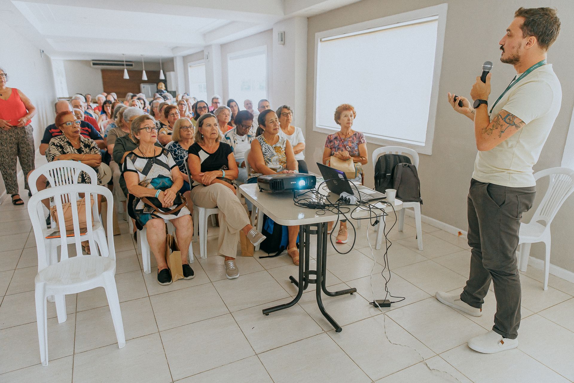 Na sequência, os(as) associados(as) prestigiaram a palestra “Longevidade, estilo de vida saudável e atividade física na terceira idade”, conduzida pelo educador físico Luis Eduardo Wearick da Silva, que abordou a importância do cuidado com a saúde e da prática de atividades físicas ao longo do envelhecimento.