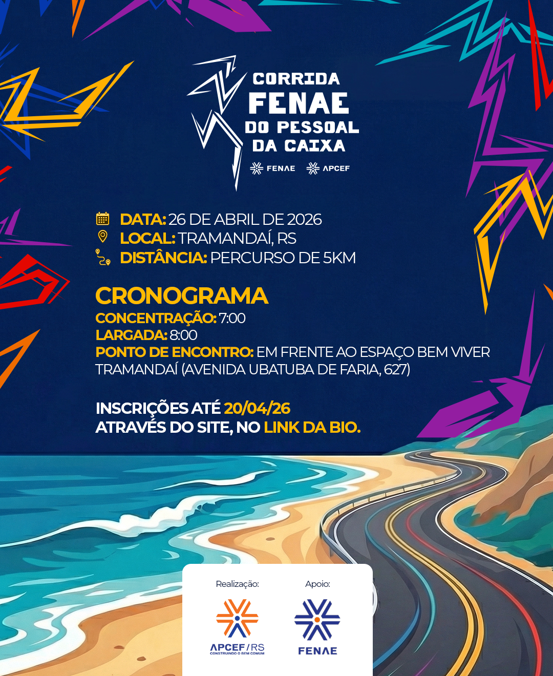 A Corrida FENAE/APCEF do Pessoal da Caixa 2026 já tem data marcada. A prova será realizada no dia 26 de abril, em Tramandaí, com concentração às 7h e largada às 8h, em frente ao Espaço Bem Viver Tramandaí, localizado na Avenida Ubatuba de Faria, 627.